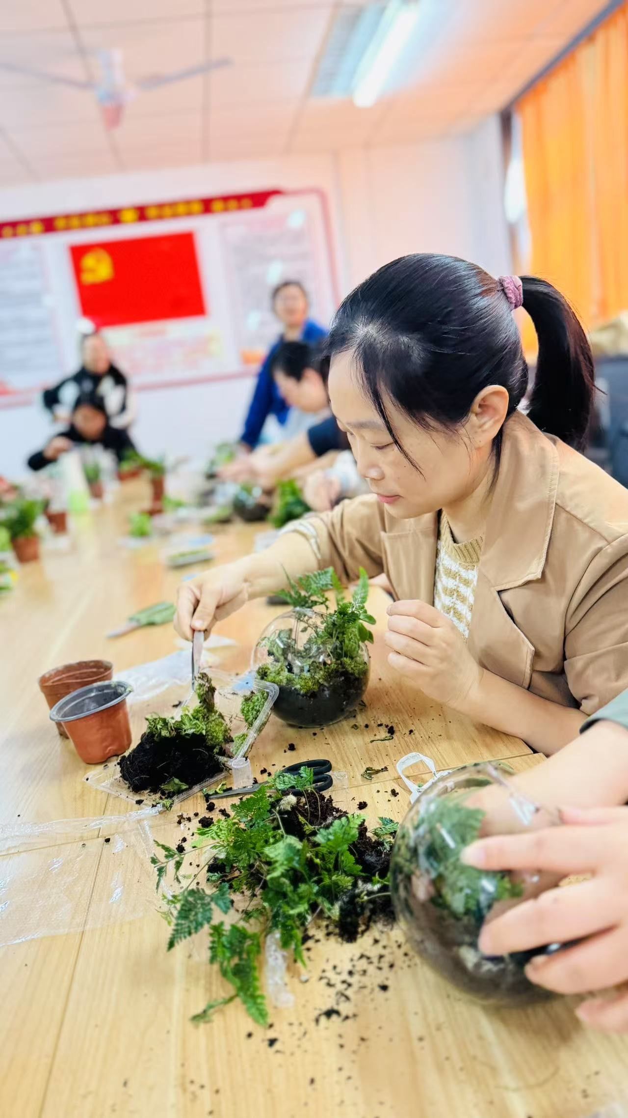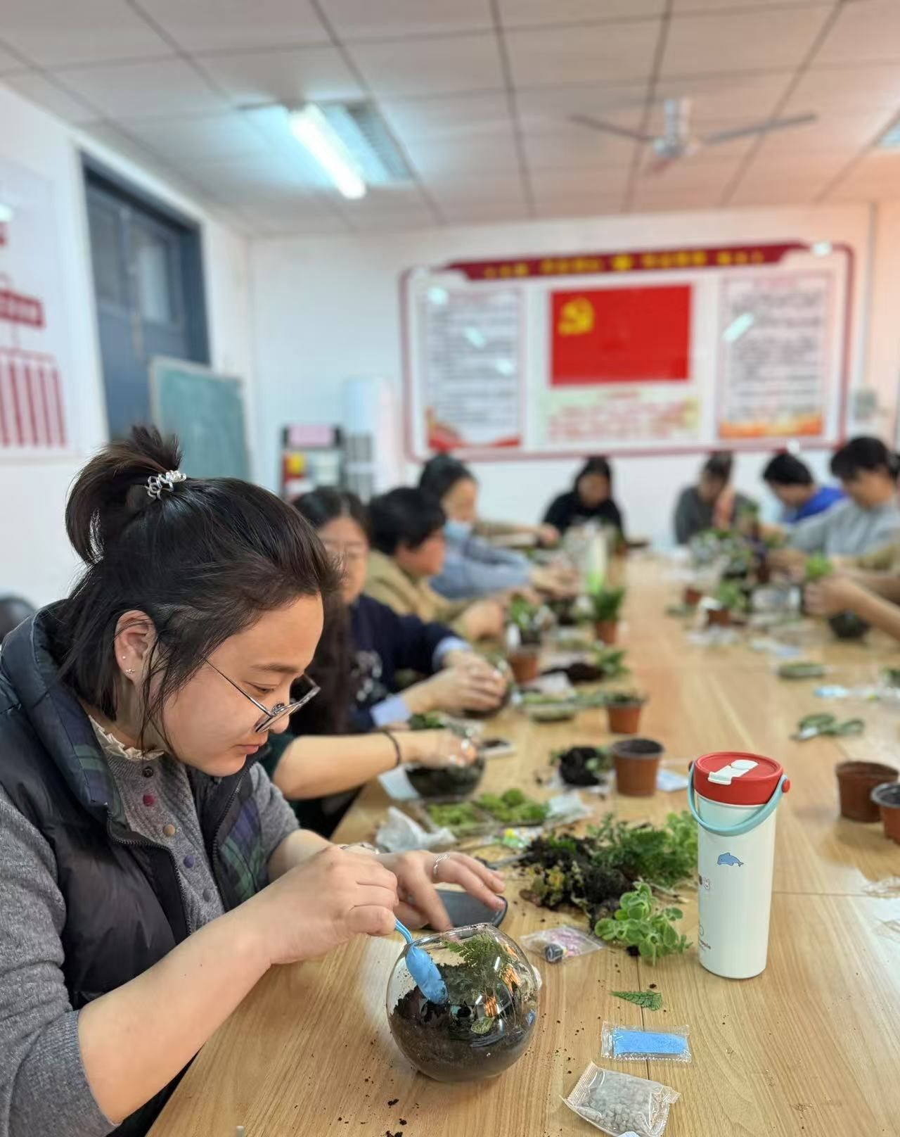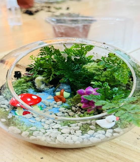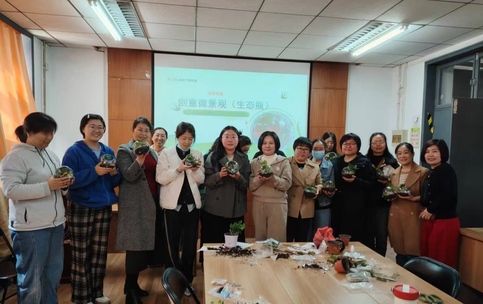王顺利详细且专业地讲解了植物、砂石、摆件之间相得益彰的搭配技巧,从植物的种类选择,依据不同空间的光照、湿度条件适配绿萝、多肉等,到砂石的质地、颜色搭配。教师们听后发挥着各自的创意,兴致勃勃挑选植物、细致铺设水苔和营养土、摆放小装饰。期间,大家相互交流心得,分享着自己的搭配灵感,现场气氛热烈非凡。