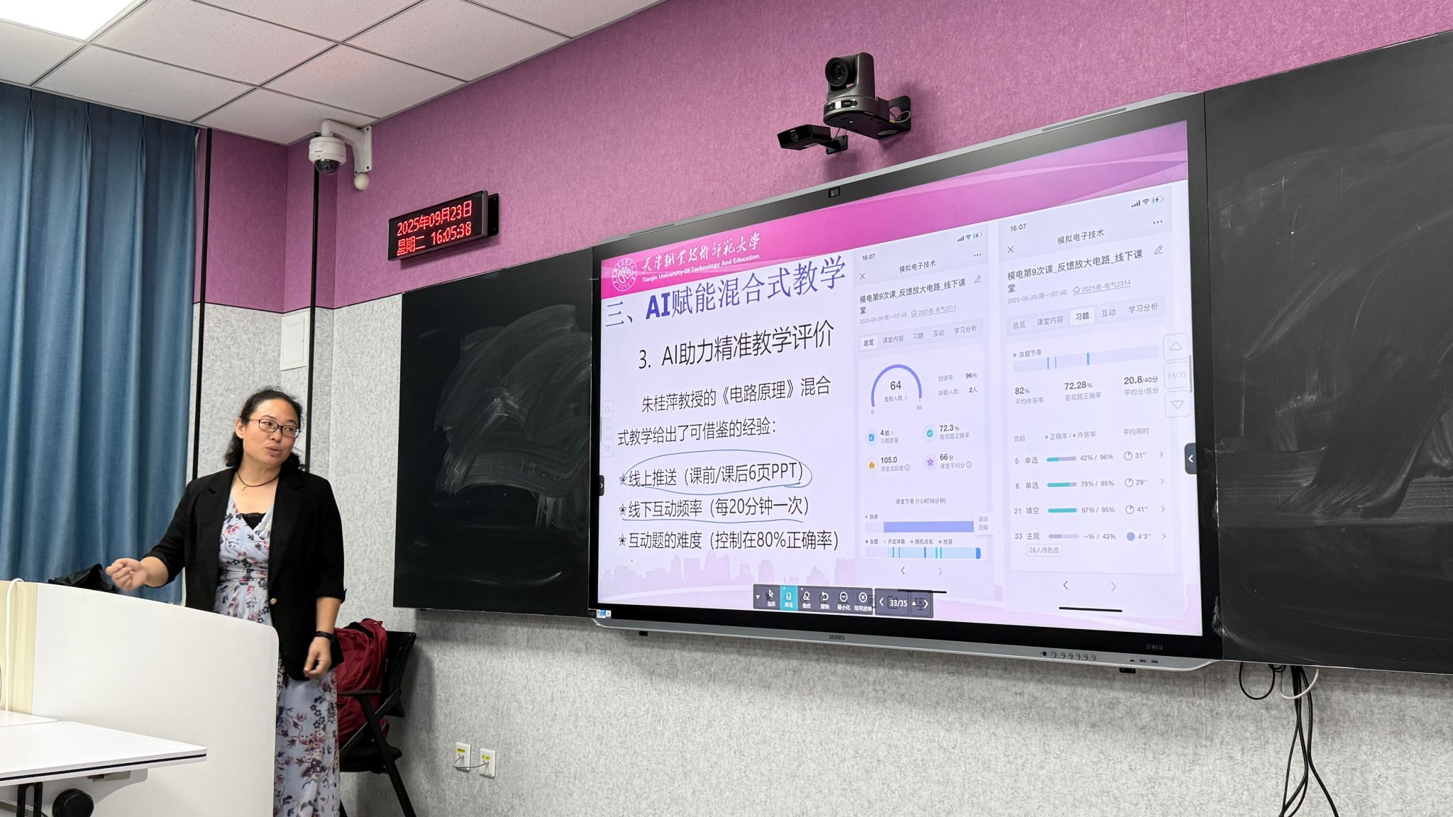 研讨会还邀请校级优秀主讲、电气技术系教师张翠敏,作“AI赋能《模拟电子技术基础》混合式教学”主题分享。该分享围绕 《模拟电子技术》混合式教学的课堂实例展开,首先阐述了数字时代开展混合式教学的必要性,接着介绍了混合式教学模式线上、线下课堂的特点和组织形式,最后重点讲解了如何在课前(AI赋能教学设计)、课中(AI助力教学实施)、课后(AI精准教学评价)三个环节进行AI赋能。