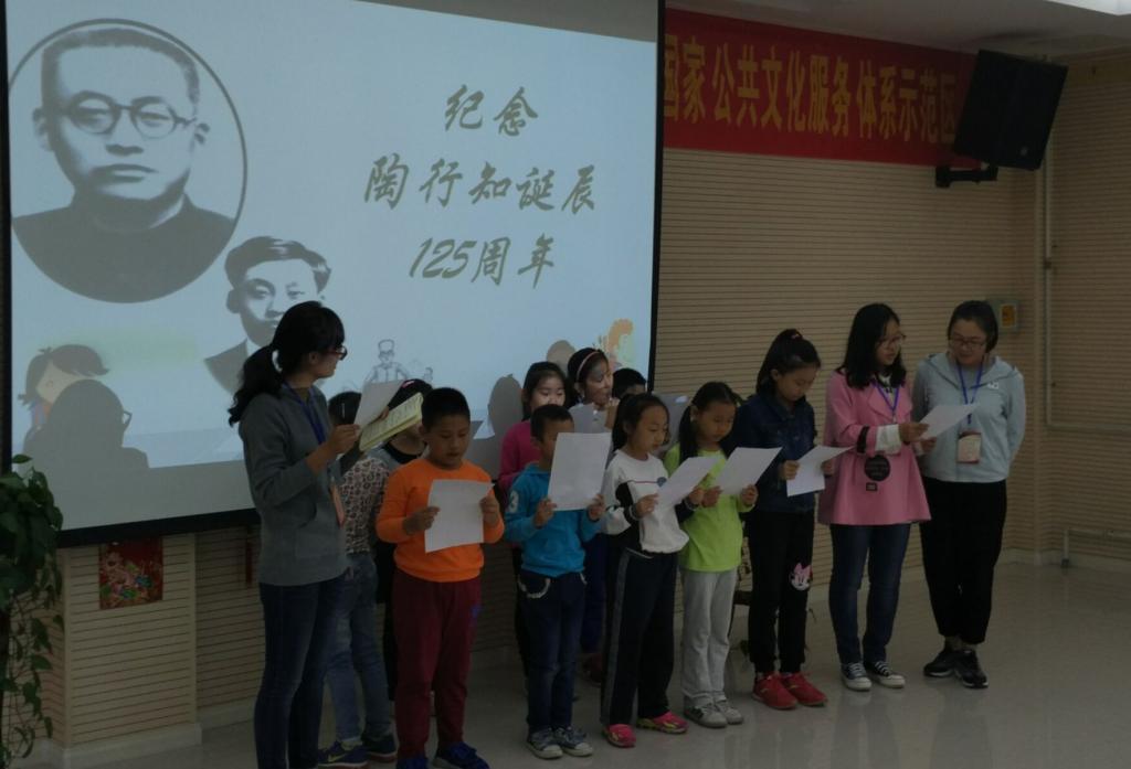 18日下午,纪念陶行知诞辰125周年主题团日活动在河西区柳林街道园丁公寓社区举行,学院青年志愿者与社区小学生们共同学习陶行知思想。志愿者播放了陶行知先生的视频片段,介绍了陶行知先生的基本资料,与小学生们一起朗诵陶行知教育名言,通过小品“四颗糖果”的表演,传播了陶行知“爱满天下”的教育理念,同学们也畅谈了曾经让自己感动的事例。最后,通过“陶行知”动画影像集滚动播放的形式,让学生们重温陶行知精神。