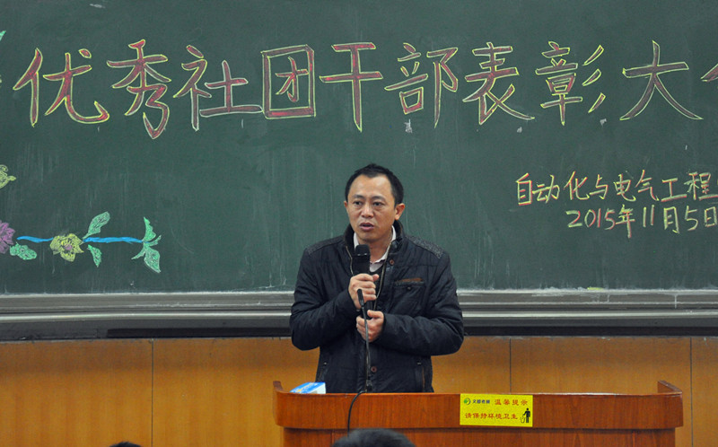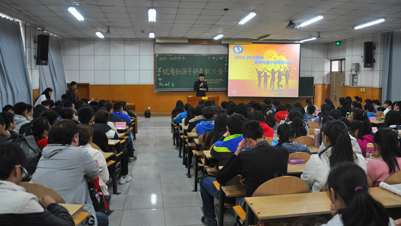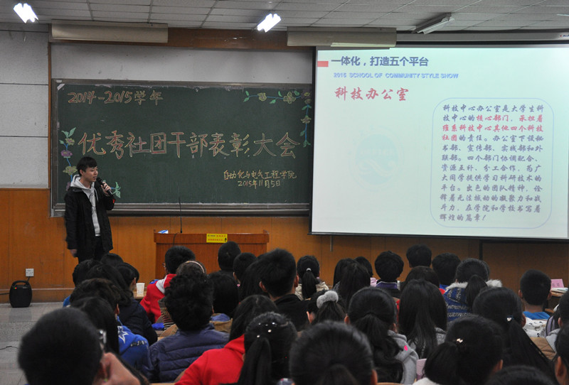 在阶梯教学楼101室举办2014-2015学年优秀社团干部表彰大会。学院党委副书记李敏,学工办主任王宣瑛,团委书记仲伟邦,科技辅导员王永亮,辅导员郭丽芳、贾旭,教务员关蓓蓓与学院11个学生社团代表参会。