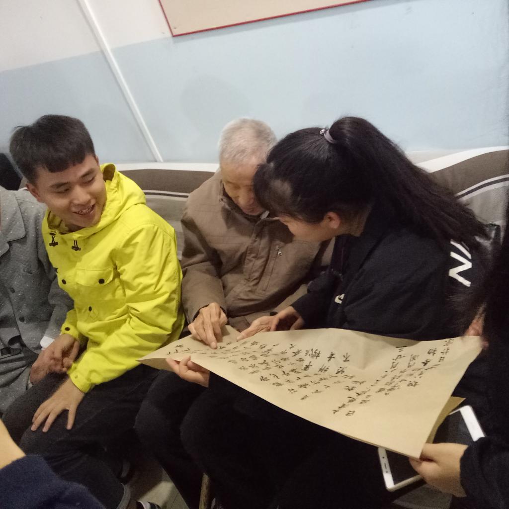 清晨,志愿者们便前往建华养老院为接下来的活动做准备。天津工业大学的志愿者们为老人们表演弹唱节目,一首《夕阳无限好》获得了老人们的阵阵掌声。学校书法协会的成员们现场为每一位老人写下一幅幅满载重阳祝福的书法作品。得知有位老人学习书法已有20余年,志愿者们就笔法、构法和笔势向老人虚心请教,受益匪浅。陪伴是温馨的祝福,志愿者们在活动展演结束后与爷爷奶奶们围坐一起聊天,听他们讲讲老故事,说说心里话,现场气氛其乐融融。