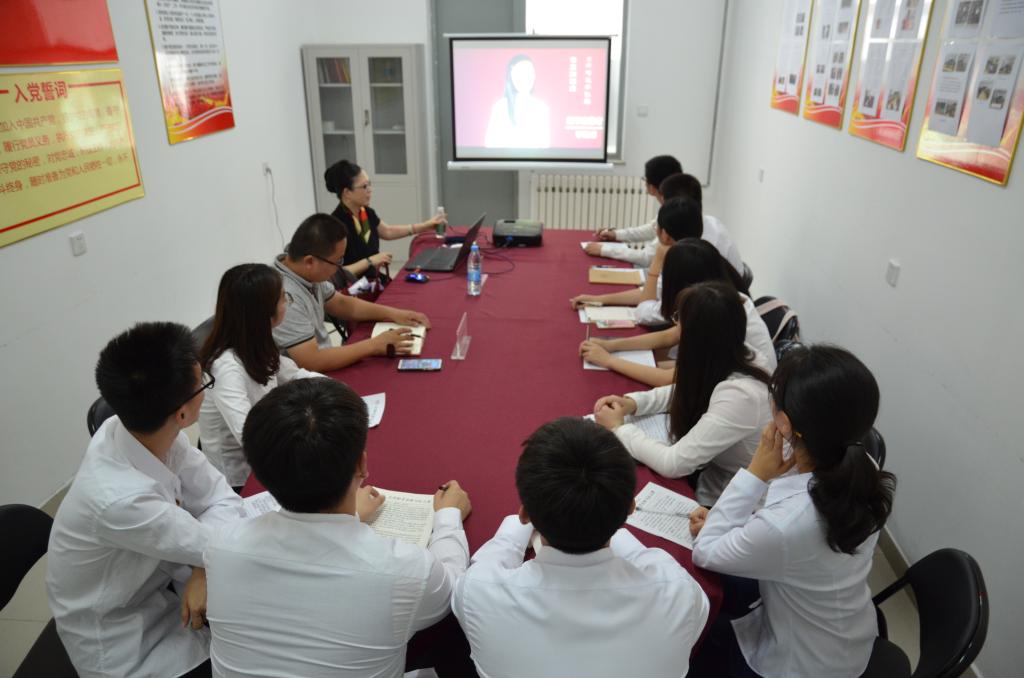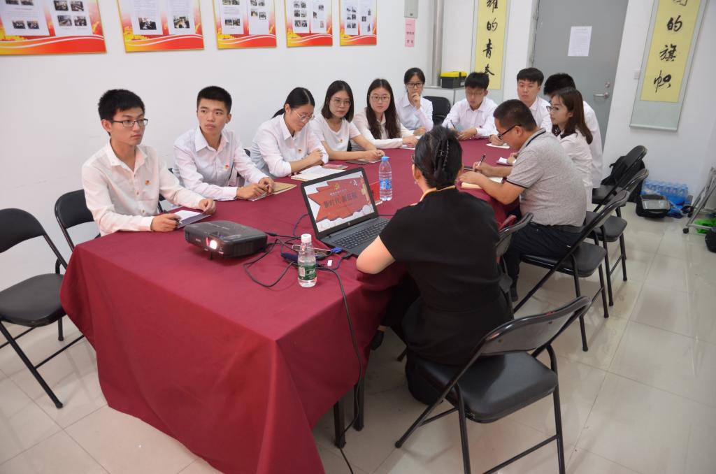 第二期青年大学生骨干培训班在学院党团活动室开展学习党的十九大精神活动,社科部鲁艳老师、院团委书记仲伟邦和第二期青骨班学员参与学习。