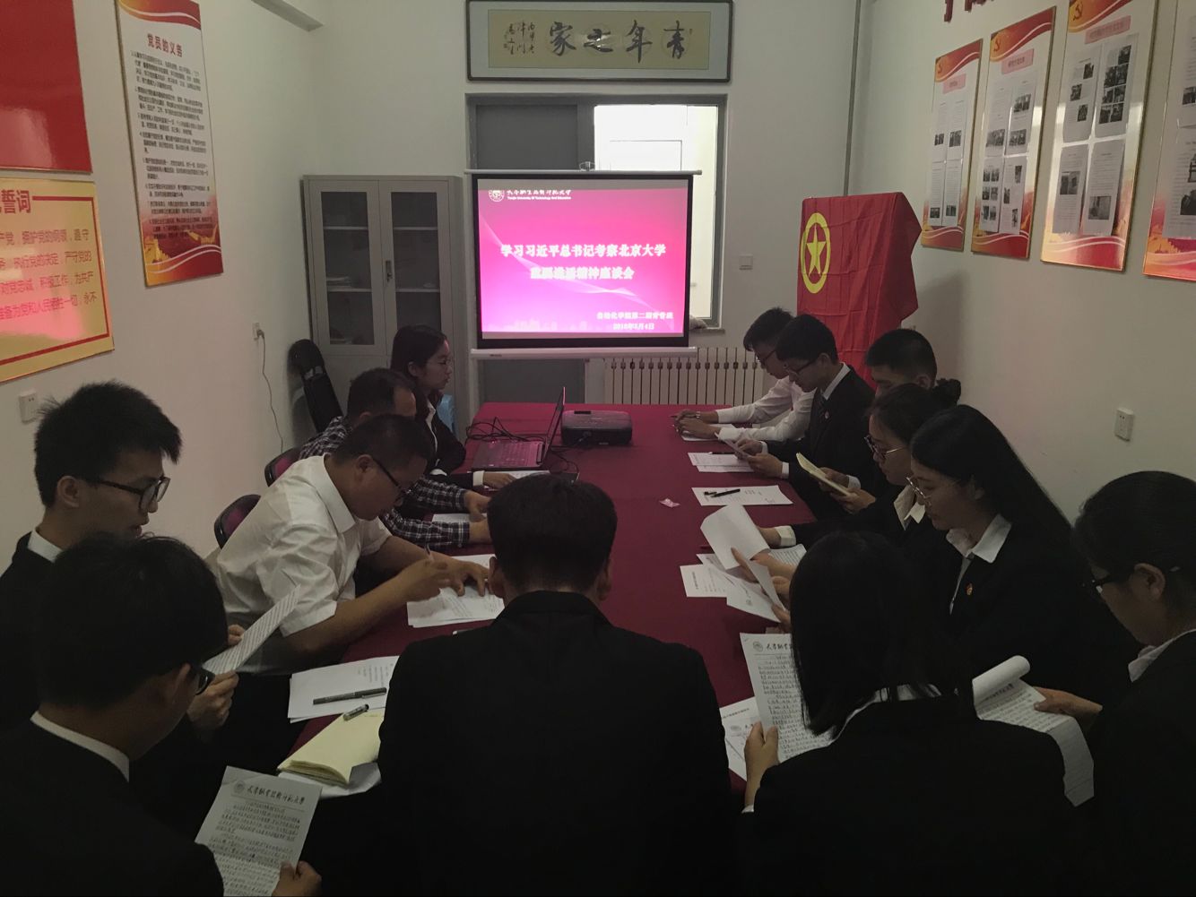 5月4日,第二期青年学生骨干培训班开班仪式在学院党团活动室举行。首先,与会人员全体起立,奏唱国歌。随后,由仲伟邦介绍青骨班成立背景和活动计划。青骨班学员代表谈到,青骨班的目标是培养一支具有创新能力和领导能力、实践能力和组织协调能力的多元化发展的学生骨干队伍。作为学员将严格遵守青骨班规章制度,认真学习、勇于实践、做好示范,成为坚定的马克思主义信仰者、践行者和传播者。随后,大家观看《五四运动》、《信仰的味道》等视频。最后,李敏作开班动员讲话,希望大家从理论学习、踏寻红色足迹、社会调研、工作实践等四个模板锻炼自己,全面提升自身综合素质,成为思想上成熟、多元化发展、行为上引领的青年学生骨干,做传播马克思主义的蒲公英,影响带动更多青年学生团结凝聚在党的周围。会后,全体成员重温入团誓词并合影留念。