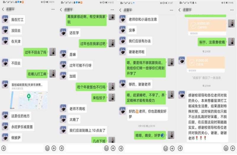 在老人回老家过年未归、家属重返工作岗位的情况下,她边照看2岁的孩子边联系学生,经常是在陪孩子入睡后的深夜继续工作。非常时期,她不能像医护人员冲在一线,但在及时做好学生思想引领、消除学生对疫情的恐慌、指导学生做好假期规划、向学生传递必胜的信心等方面,她始终尽己所能、全力以赴。
