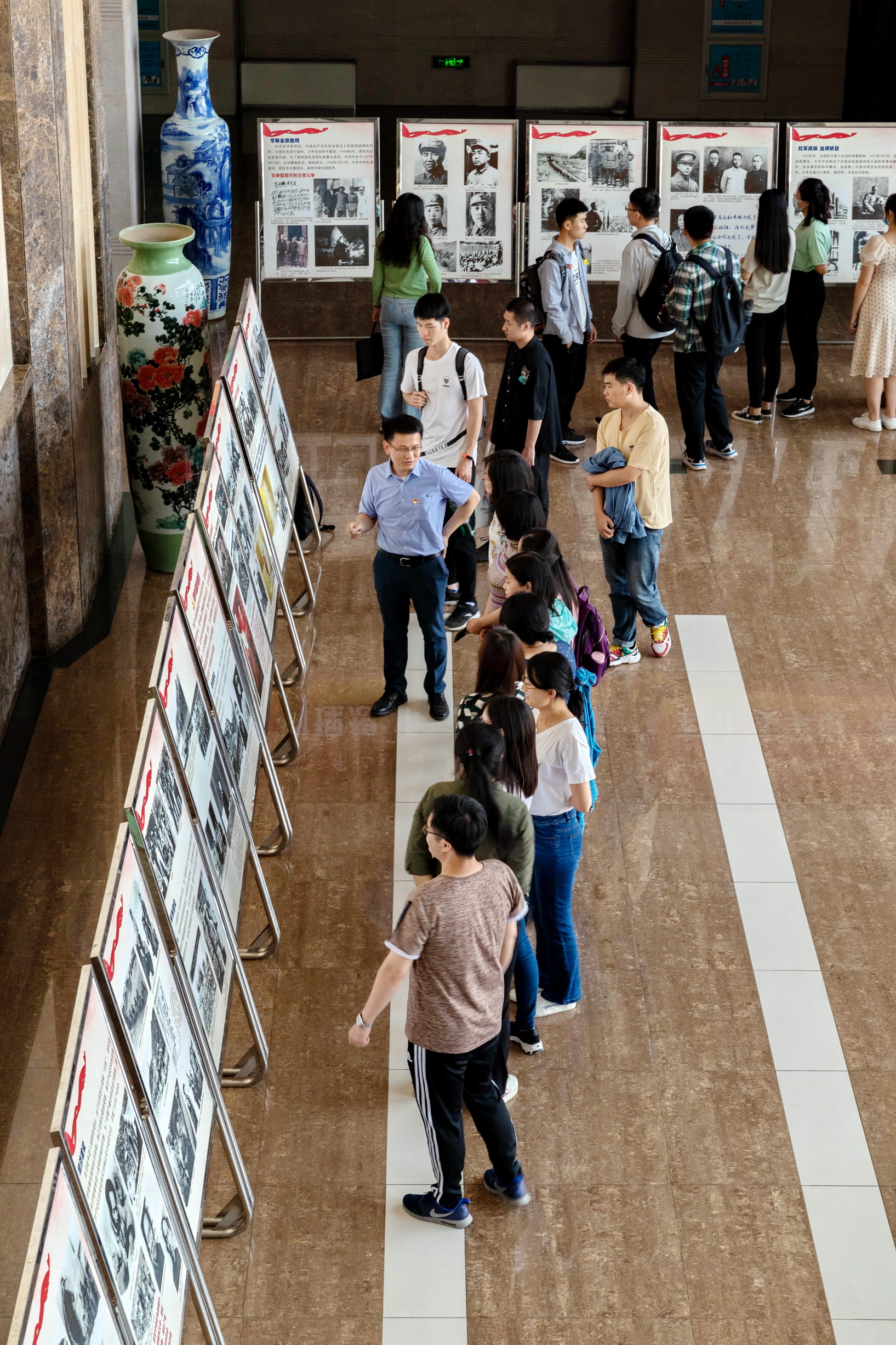 师生做讲解。学院党委组织全体教师、学生党员、入党积极分子参观学习。
