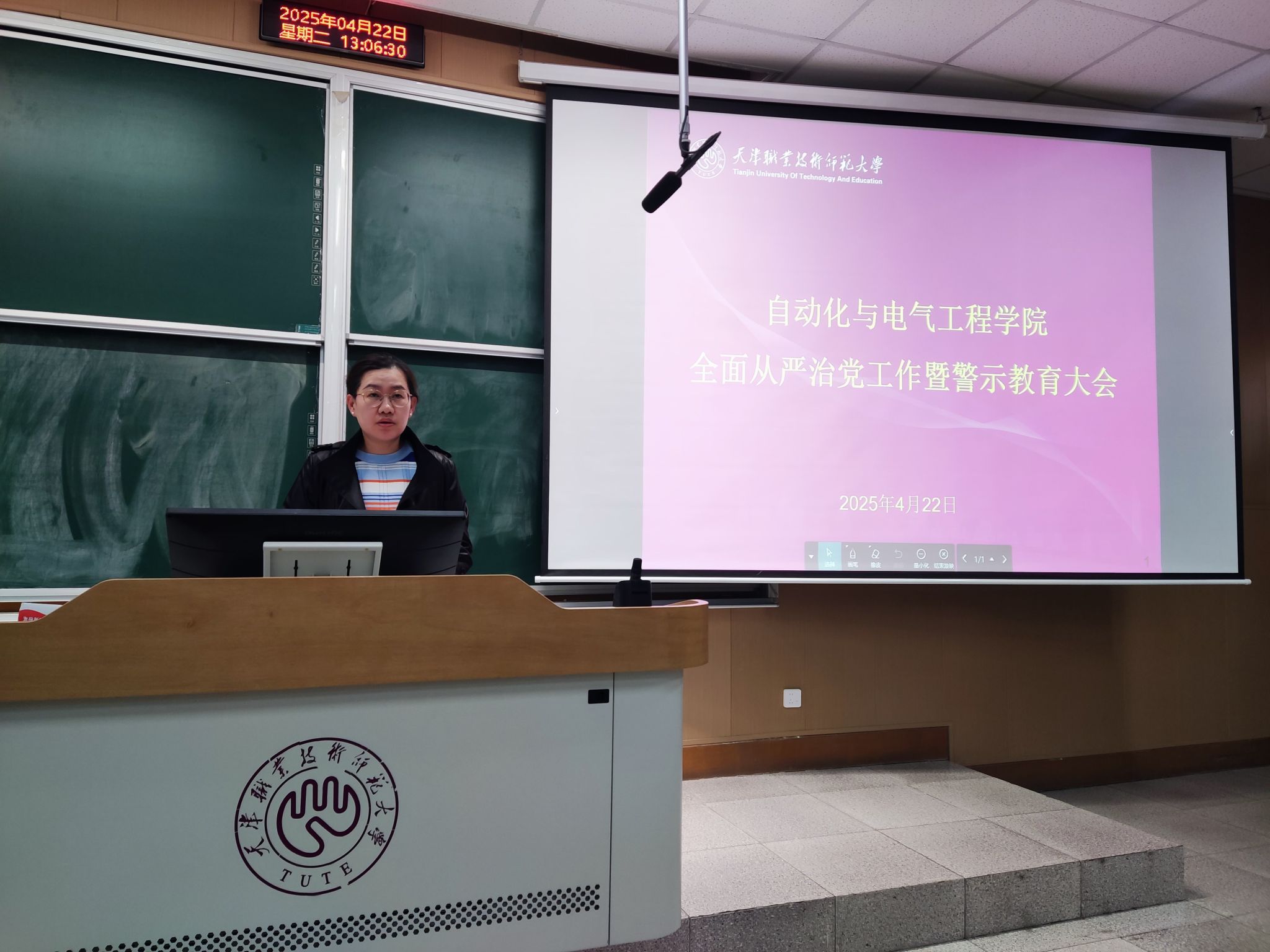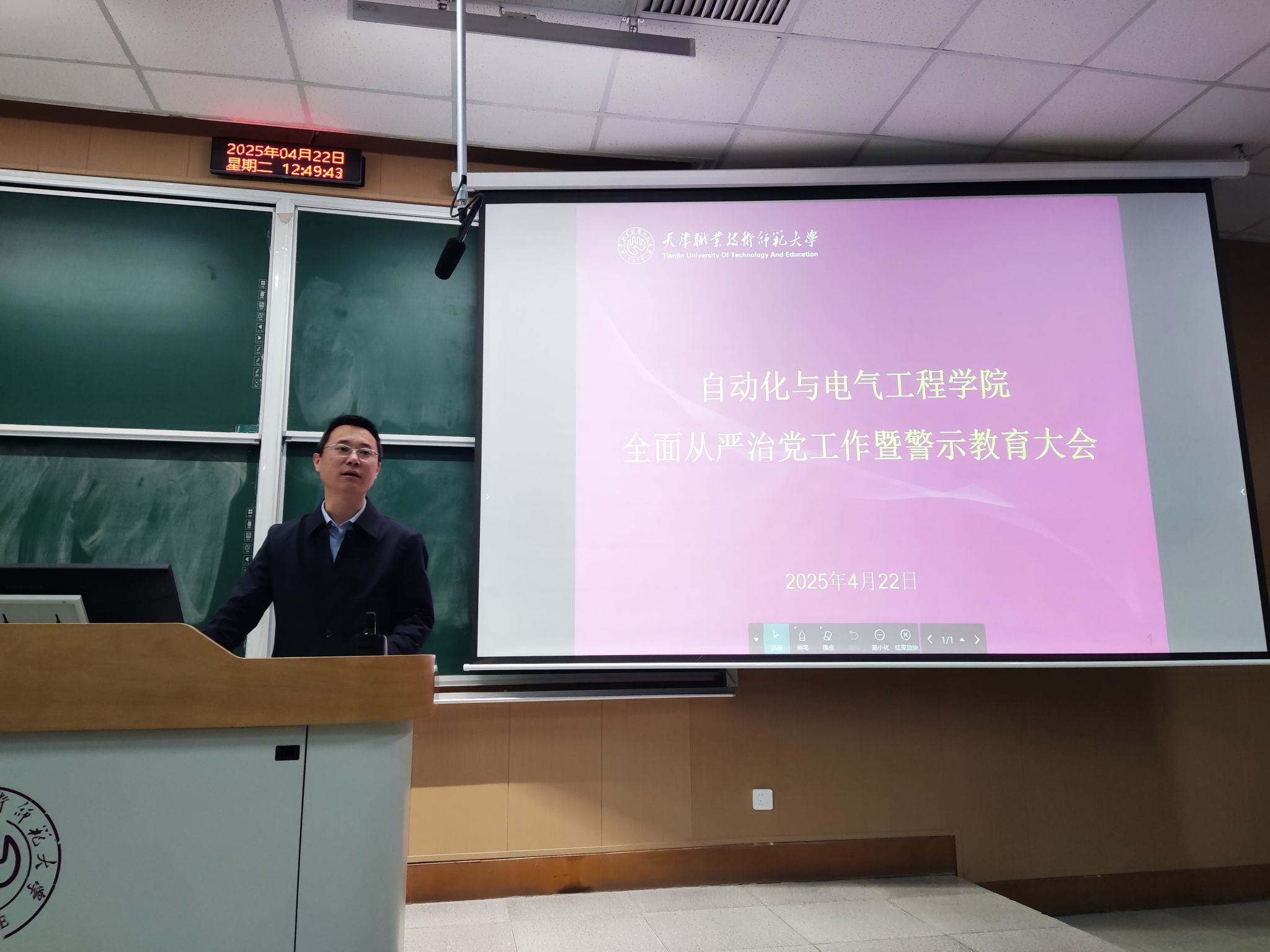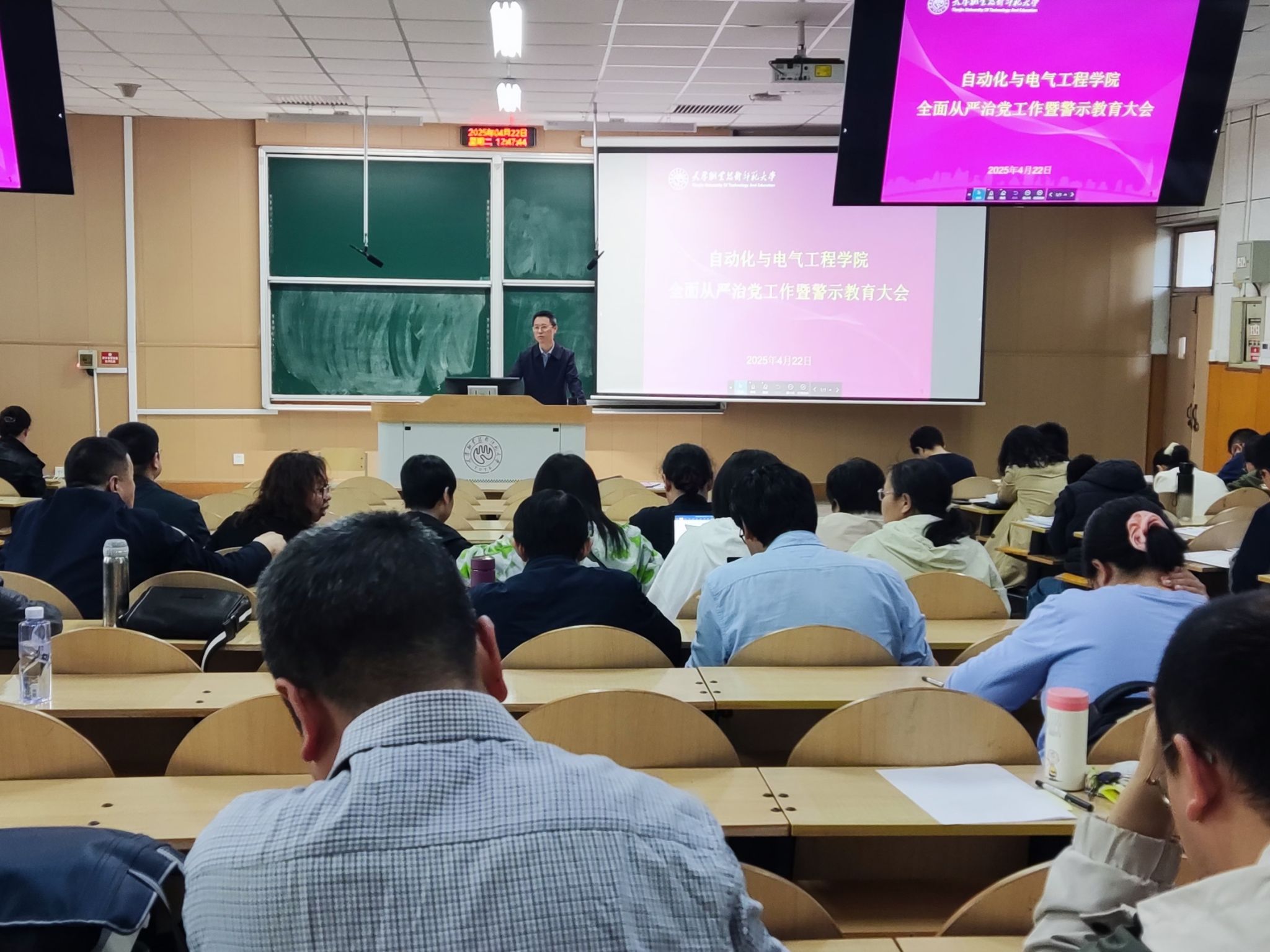 在阶梯教室召开全面从严治党工作暨警示教育大会。学院全体教职工参会,会议由学院党委副书记兼纪委书记程君主持。