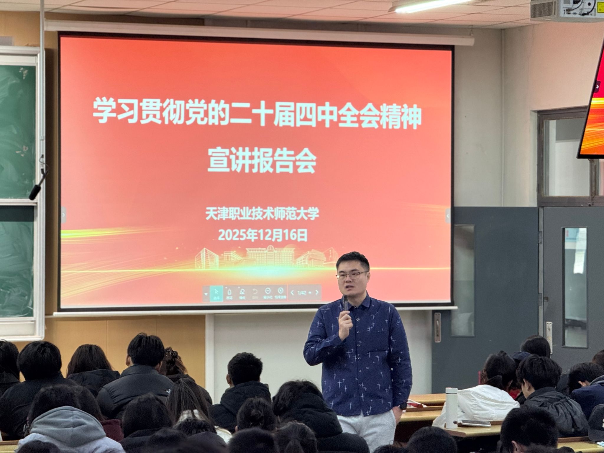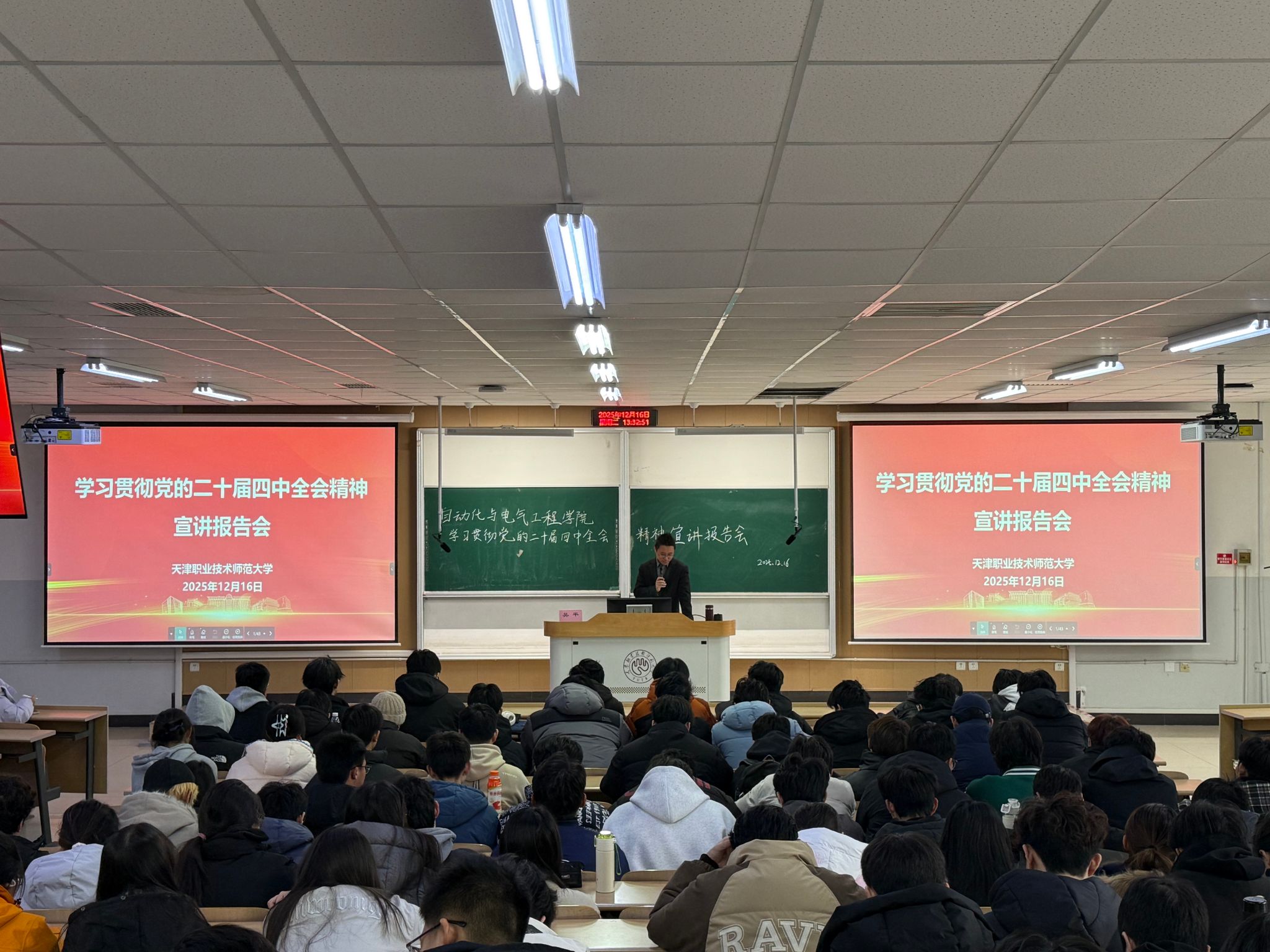 学院党委班子成员以“深入学习贯彻党的二十届四中全会精神奋力谱写中国特色、世界一流职业技术师范大学新篇章”为主题进行宣讲,紧紧围绕习近平总书记在党的二十届四中全会上的重要讲话精神和《中共中央关于制定国民经济和社会发展第十五个五年规划的建议》,对全会精神进行了全面系统、深入浅出的宣讲阐释并紧密结合当前国内外形势和国家发展战略以及学校、学院“十五五”事业发展规划进行分析解读,引导学生深刻认识个人成长与国家发展的紧密联系,教育学生将专业学习与经济社会发展需求紧密结合,增强肩负强国使命的责任担当