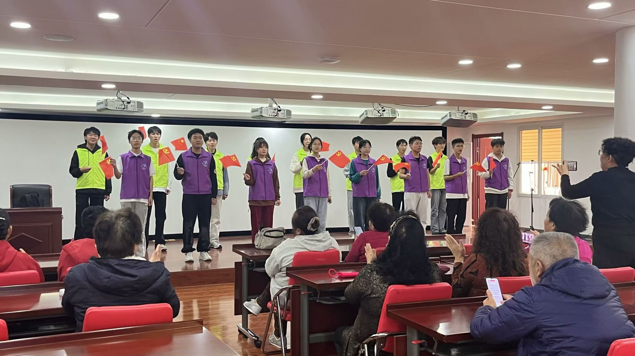 活动中,退休工人党员们向学生志愿者们分享了他们曾经在工作岗位上的点点滴滴,以及那些岁月中锤炼出的坚韧与执着,这些生动的故事不仅让学生们深刻感受到了老一辈工人的辛勤付出和无私奉献,更激发了他们传承红色精神、弘扬工匠精神的决心。随后,志愿者们与老人们一同合唱了《歌唱祖国》等红歌,不仅表达了中华人民对祖国的深情厚谊和报国之心,更体现了一代代中华儿女为祖国繁荣富强奋力拼搏的赓续传承。红歌的力量,让老人们感受到了青春的活力与热情,也让志愿者们接受了一次深刻的红色教育。