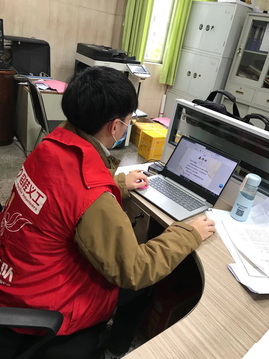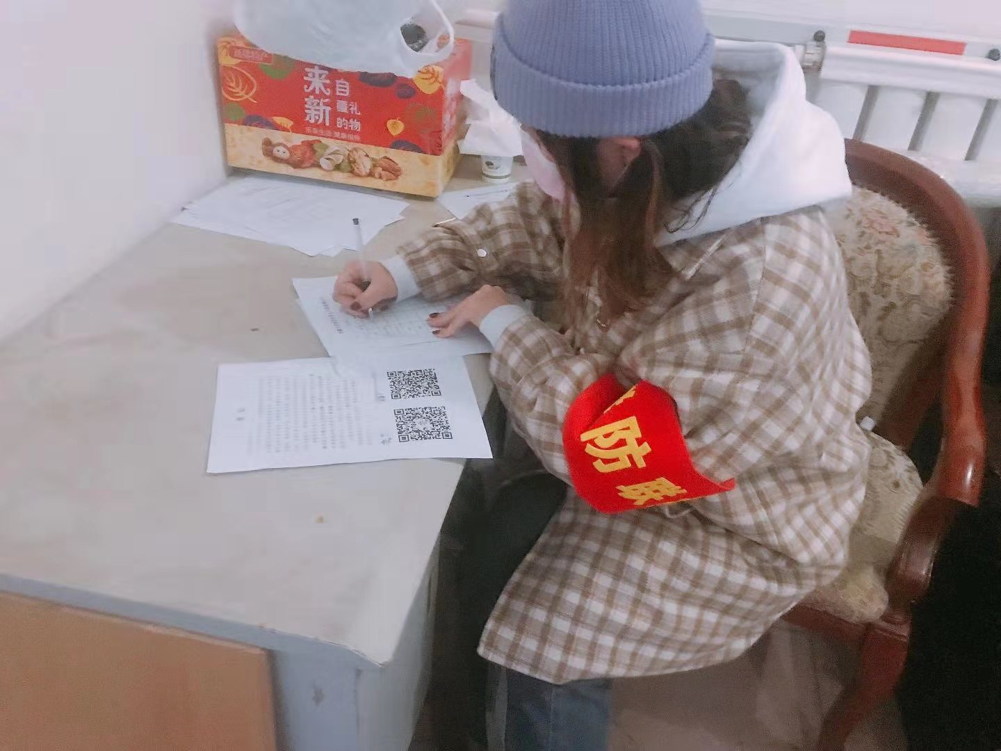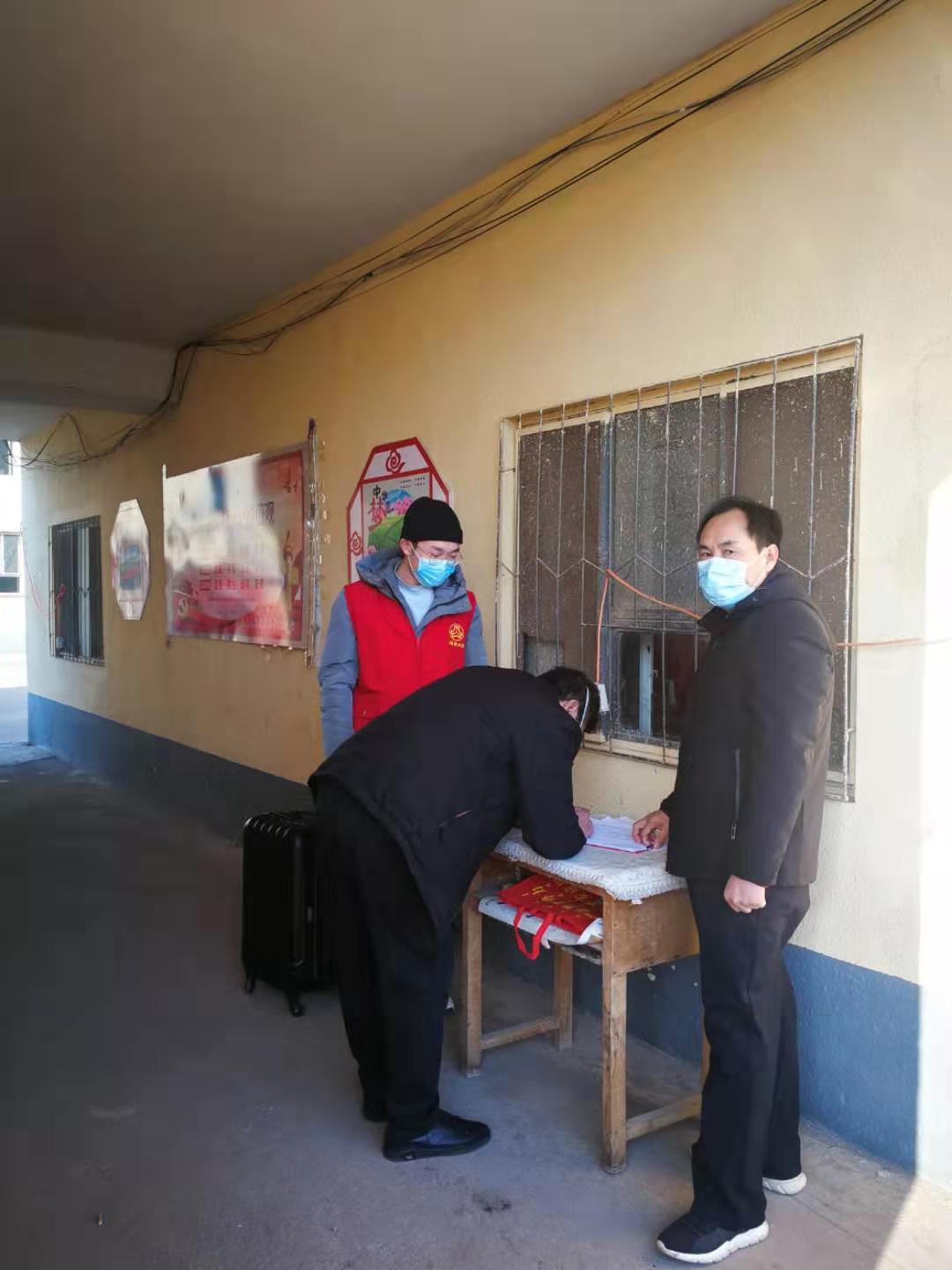 每天早上7点,郭禹廷准时准点到社区报到。近日来,内蒙古巴彦淖尔市的最低气温达到零下二十多度,每天早上去值班的时候天都黑着。根据疫情防控工作的需要,他每天需要登记出入人员、询问出行情况、测量体温、消毒、管理社区的微信群并填表汇报。“每天要忙到下午4点左右吧,挺累的,回家都想躺着休息一下”,他自己说。