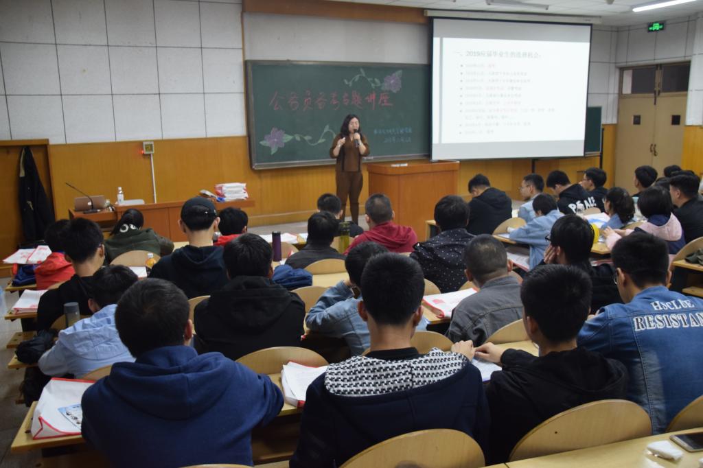 在阶梯教学楼101举办2019届毕业生公考备考专题讲座。学院邀请2005级校友、铸成教育创始人佟彤老师担任主讲,2019届备考公务员的毕业生参与讲座。