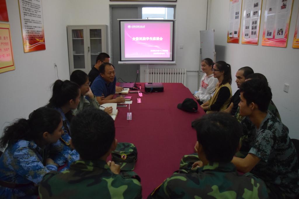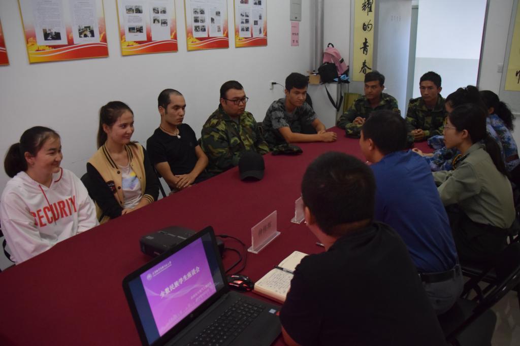 在党团活动室召开新疆籍少数民族学生座谈会。学院党委副书记李敏、团委书记仲伟邦、2018级新生辅导员田嘉欣以及九名新疆籍少数民族学生代表参会。