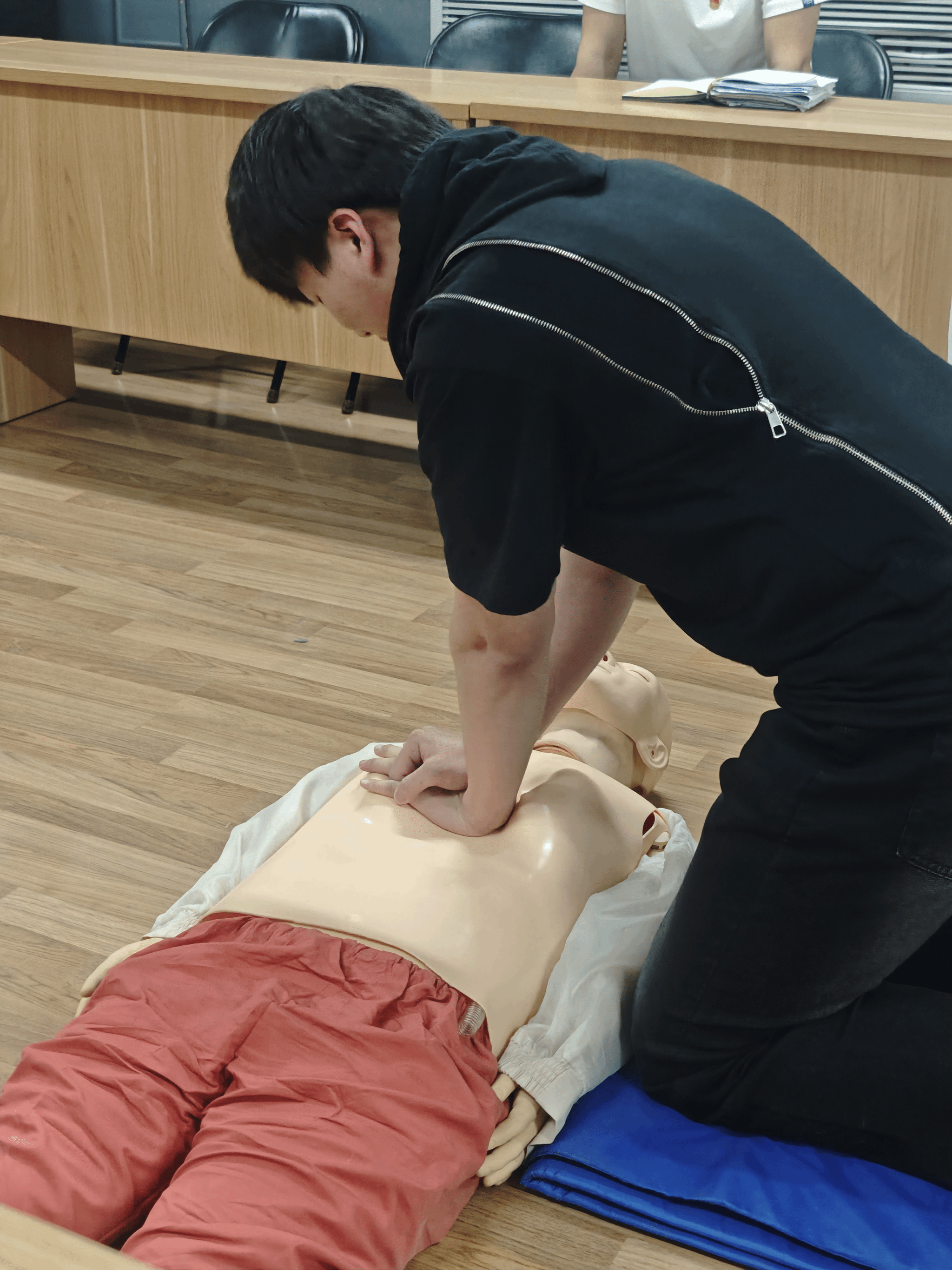 讲座中,王迪采用“理论+实操”的双轨教学模式,详细讲解了成人心肺复苏和AED 自动体外除颤仪的使用方法、成人气道异物梗阻应对措施的操作步骤和注意事项,并向同学们强调正确进行现场急救的重要性。在实操环节,王迪利用模型进行分步骤操作示范、手把手指导、一对一考核,并指导在场同学模拟心肺复苏,将理论知识转化为实操技能。