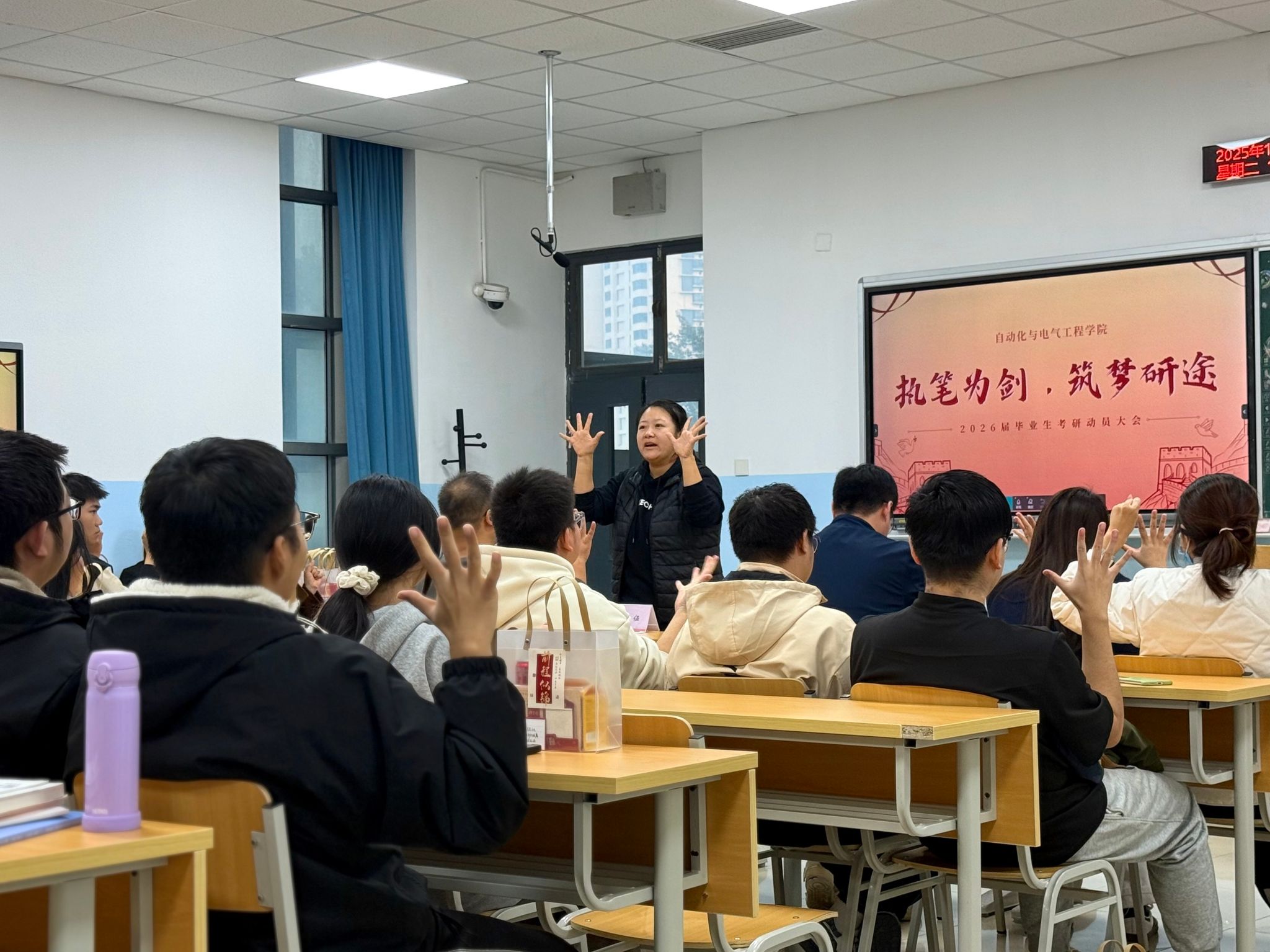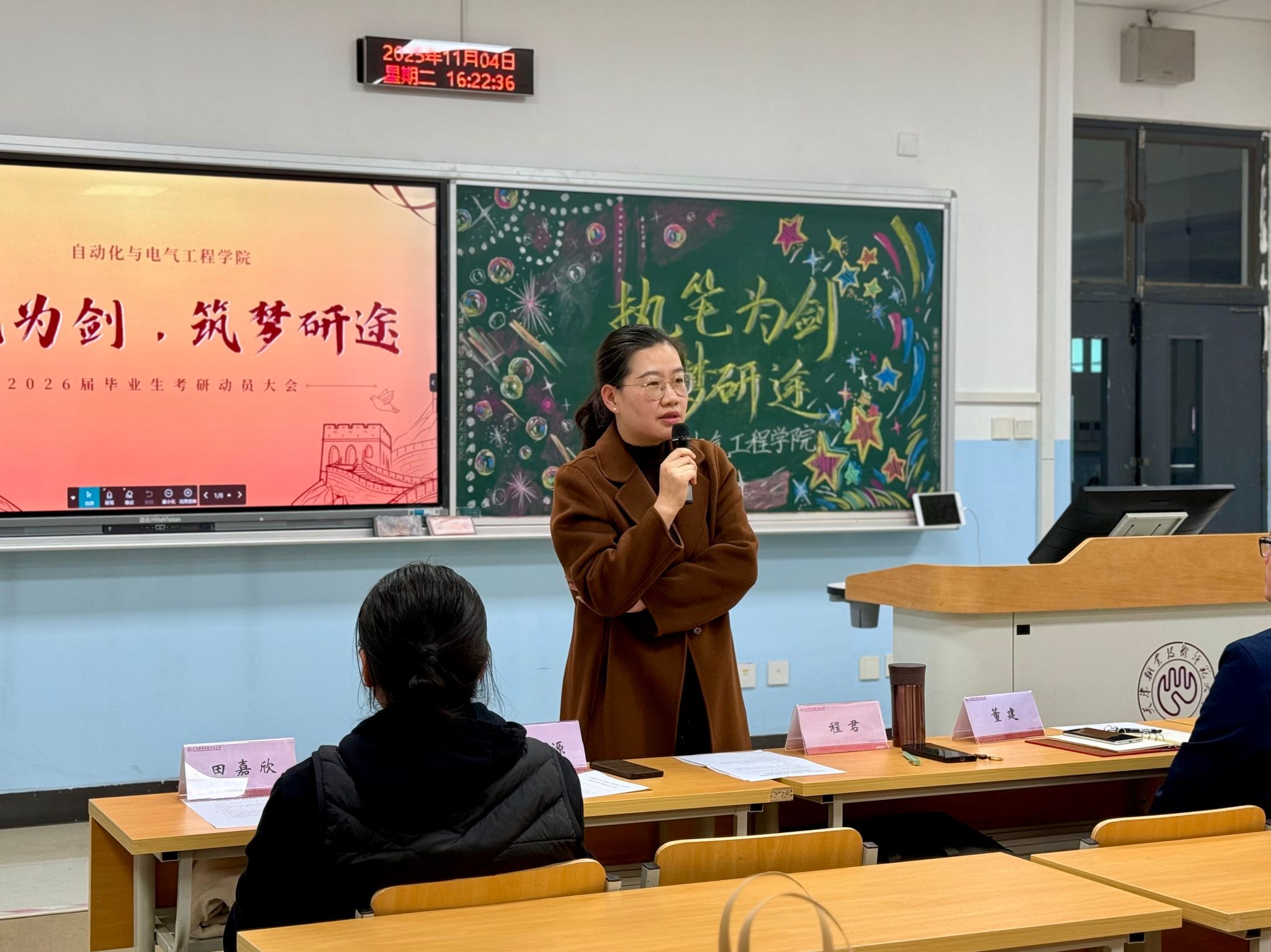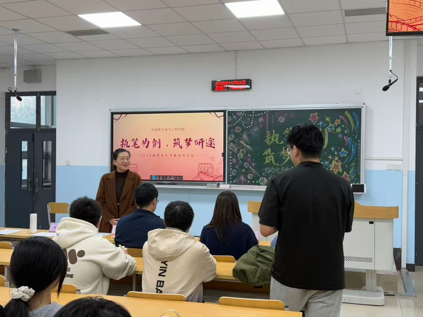 为精准对接考研学子需求,明晰备考方向,缓解心理压力,11月4日,欧乐影院 在二教207召开“执笔为剑,筑梦研途”2026届考研学生慰问活动。院党委副书记程君,副院长董建代表学院领导班子莅临现场对考研学子进行慰问,辅导员田嘉欣、丁俊伍、李泓源、王珊,研究生代表朱彦洁2026届考研毕业生代表参与本次动。