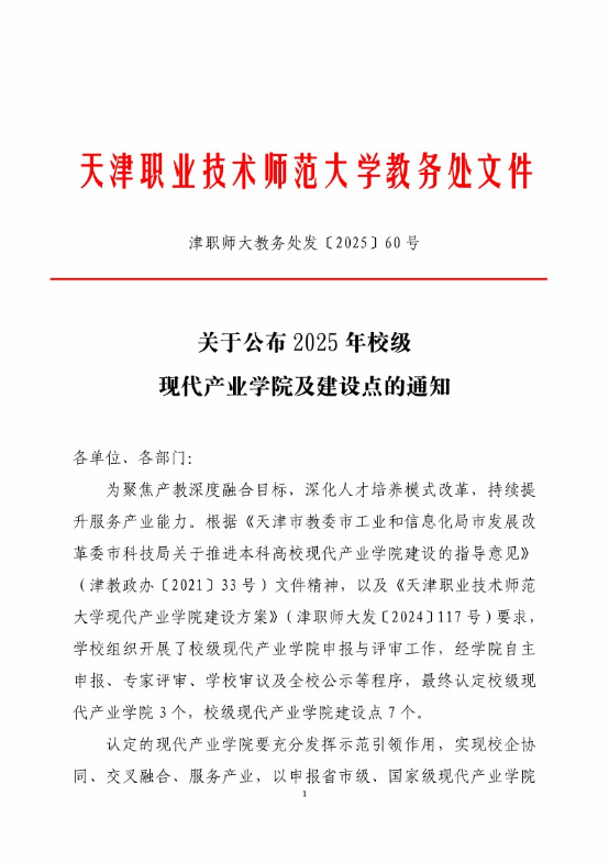 2025年校级现代产业学院申报工作的通知》(津职师大教务处发〔2025〕7号)等文件精神,经学院申报、专家评审、学校审议等程序,被学校认定为校级现代产业学院——智能控制与机器人现代产业学院。